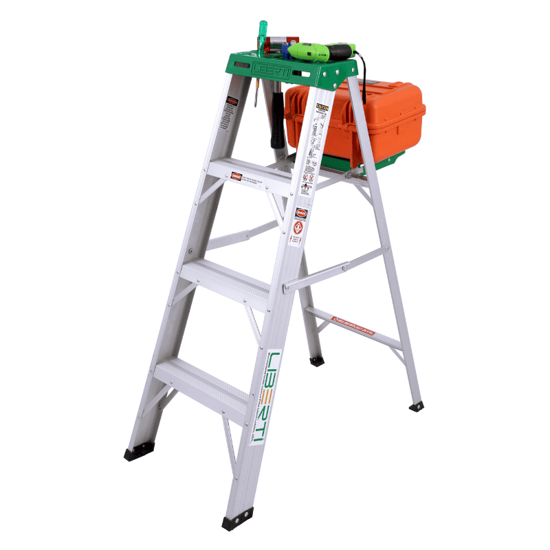 The Liberti 1204 medium-duty aluminium step ladder is designed for stability and convenience. Featuring a moulded copolymer utility top to hold tools and a hook to hang a bucket, this ladder ensures efficient use during any task. Its wide 3” slip-resistant serrated aluminium steps provide safe climbing, while the fold-down utility tray accommodates paint accessories, toolboxes, and more. The ladder is equipped with slip-resistant safety shoes and aluminium extruded braces for extra stability.