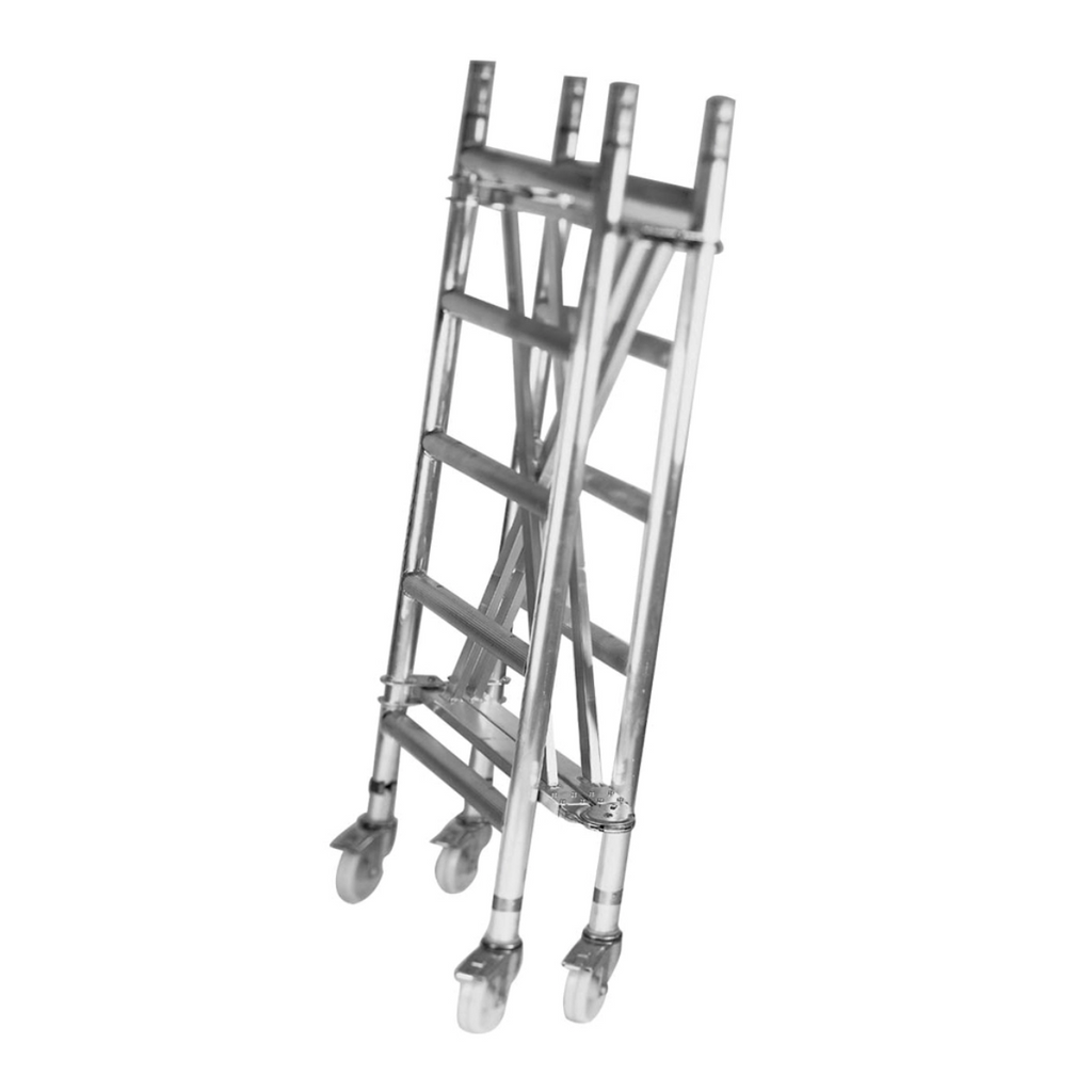 - Scaffold tower with folding base section for easy handling and transport. Overlapping bracing is used for additional safety and stability